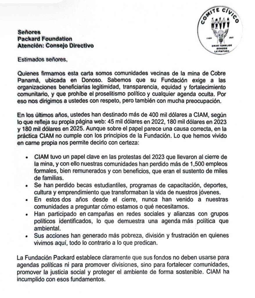 En nota enviada a Packard Foundation, el Comité Cívico de Donoso, expresa su preocupación ante el rumbo que pudiese haber tomado los más de 400 mil dólares, toda vez que aseguran que el CIAM no ha cumplido con los principios que imparte la fundación.