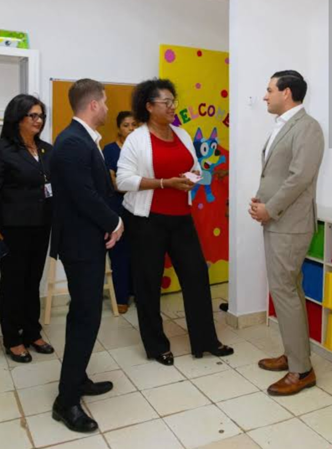 El embajador de Estados Unidos, Kevin Marino Cabrera, conversa con el alcalde de la Ciudad de Panamá, Mayer Mizrachi, y autoridades locales dentro del Centro de Desarrollo Infantil Las Mañanitas en San Miguelito. En el espacio se observan mesas y sillas coloridas, resaltando el entorno educativo y la colaboración para apoyar el desarrollo de la primera infancia.